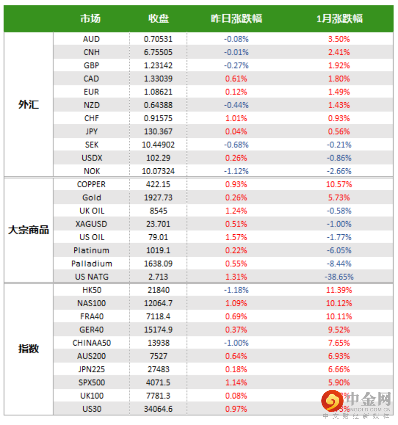 黄金日内经历深V反转,收盘接近1930,连续三个月收涨。原油1月小幅下跌1.6%,中国需求的复苏和欧美经济衰退的博弈还在继续。铜价单月+10%的表现一方面是受到供应端的制约,但或多或少也显示出市场对经济前景的乐观期待。
