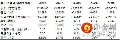 我们认为公司在2022年面临的严峻的宏观及行业环境将在2023年得以改善。公司作为环保行业龙头央企,具备把握“双碳”目标带动下的新一轮发展机遇,并且,公司多渠道融资能力有利于为公司提供良好现金流及资金成本优势。我们调整公司2022/2023/2024年收入预测至421亿/421亿/428港元,归母净利润至49亿/54亿/56亿港元。调整公司未来12 个月目标价至4.82港元,相当于2023年的5.5倍市盈率,对应现价有39%的涨幅,维持买入评级。