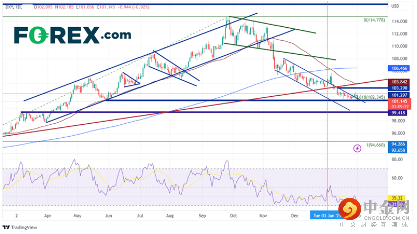 由于会议不够鹰派的言论和会前的市场定价,美元随即遭到抛售。美元指数(DXY)大幅走低,回到近期通道的顶部趋势线下方,低于2022年5月30日的水平支撑位101.29。DXY的下一个支撑位在心理整数支撑位100.00。低于该点位,价格可能会跌至2022年3月的支撑位99.42附近。要想扭转跌势,它得回到昨日高点102.60上方。下一阻力位于1月12日的高点103.29。