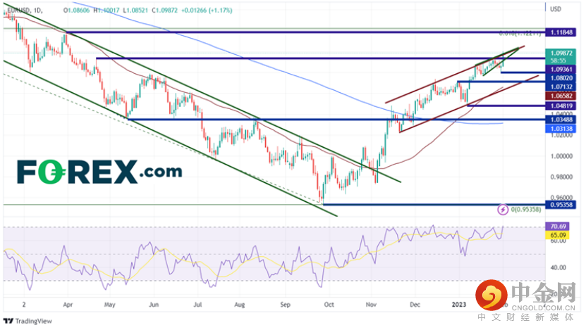 与DXY相反的是欧元/美元。该货币对今天取得了亮眼的突破,在鲍威尔的新闻发布会后达到了1.1002的高点。欧元/美元一直在通道内上涨,直到触及水平阻力位4月21日的高点1.0936。自1月中旬以来,该货币对一直处于上升楔形中,并在1月31日跌破楔形。今天,在新闻发布会之后,价格回到楔形并冲破先前的阻力位1.0936。如果价格继续走高,下一阻力位在2022年3月31日的高点1.1185,然后是2022年的高点到2022年的低点区间的61.8%斐波那契回撤位1.1221。第一支撑位在1月31日的低点1.0936,然后是副水平支撑位1.0802。如果欧元/美元跌破该点位将考验50日移动平均线1.0658。