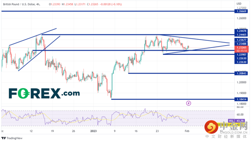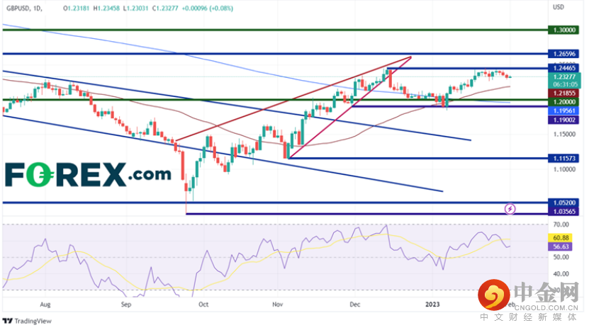 在4小时图内,英镑/美元恰好徘徊在1.2300附近的水平支撑上方。 如果美联储发出就业市场强、工资水平高、整体通膨的信号,英镑/美元应出现下行趋势。 第二档支撑位落在1月24日低点1.2263。 由此向下,货币对价格可能下行至50天移动均线1.2185(见日线图),随后下探1月12日低点1.2084。 倘若美联储发出加息措施成功发挥效果的信号,甚至可能在3月暂停加息,英镑/美元或会进一步走高。第一个阻力位可能在1月23日1.2410附近的下行趋势线出现,由此向上会在1月23日的高点1.2447遭遇阻力。继续向上,货币对价格可能触及2022年5月27日高点1.2667。