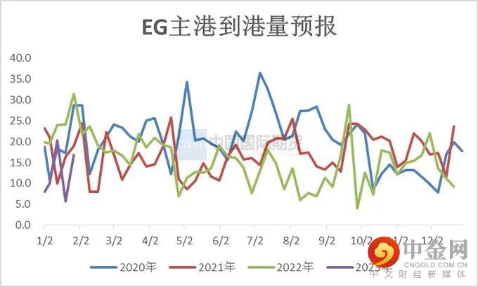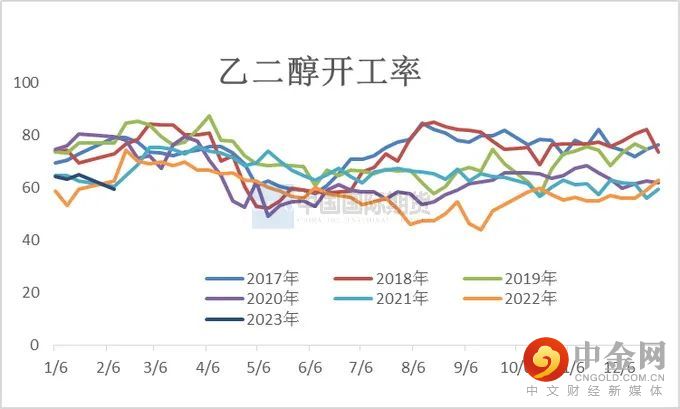 2023年1月国内乙二醇总产能为2477.5万吨,煤制乙二醇总产能为913万吨,新增盛虹炼化100万吨,另外国内142万吨装置长停两年以上且暂无重启计划,年底将产能予以剔除。镇海炼化80万吨25日停车目前已重启。中石化武汉28万吨检修预计停车1-2个月;卫星石化90万吨的MEG装置月底停车小修,预计时间在半个月左右。阳煤寿阳20万吨12月初停车重启时间待定。新疆天业95万吨重启目前负荷提升中。新杭能源40万吨负荷提升中。1月乙二醇平均开工率63.48%,较12月提升5.1%。