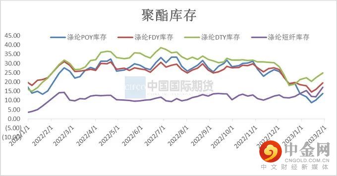 预计2月上旬和中旬,终端的原料库存仍可满足其生产所需,节后的涤丝销售缺乏刚需,若没有投机需求补充,预计至2月下旬涤丝POY权益库存可能攀升至半个月偏上,如果涤丝工厂开车节奏超预期,权益库存甚至接近20天附近。长丝工厂的压力将在2月下至3月份逐渐体现。