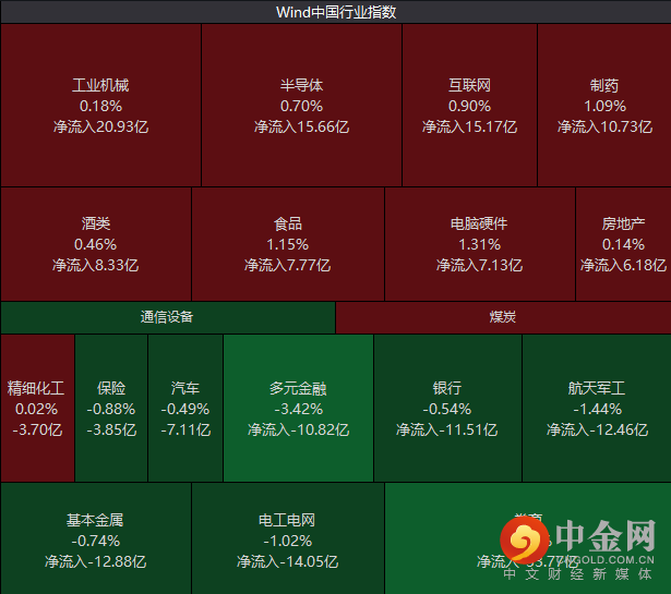 行业板块方面,工业机械、半导体、互联网、制药等呈现净流入态势,券商、电工电网、基本金属等内容则资金净流出。
