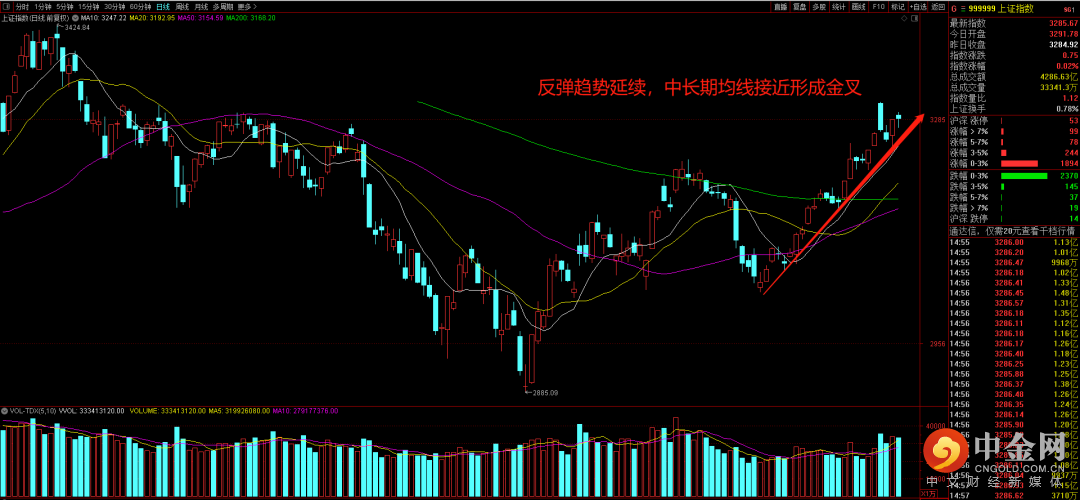 沪指昨日震荡走高收出小阴线形态,延续近期反弹向上的趋势。值得留意的是,代表中长期趋势的50天均线即将上穿200天均线形成金叉形态。中长期均线形成多头排列,有助于市场的重心不断提高,是市场中长期走势趋于良性的积极信号。短期来看,10天均线和反弹趋势线依然是观察行情的重要指标。