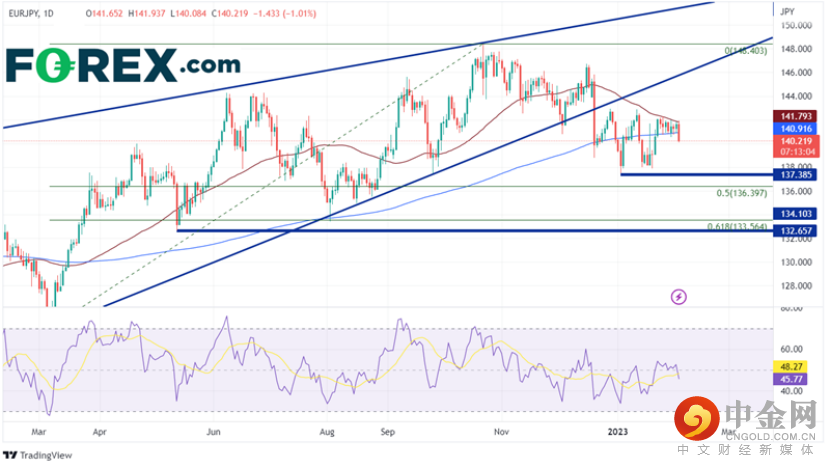 对加息和随后的新闻发布会反响最大的货币对之一是欧元/日元。在50日和200日移动平均线(140.92/141.79)之间横盘整理一周半后,欧元/日元大幅走低。该货币对跌破了最近的区间,并有足够的下行空间。第一支撑位在1月3日的低点137.39。在此之下,价格可能会跌至从2022年低点至2022年高点区间的50%回撤位136.40,然后是61.8%斐波那契回撤位133.56。阻力位很接近,位于近期区间的底部和200日移动平均线。在区间顶部和50日移动平均线上方,价格可能会移动到上升楔形(该货币对于2022年12月20日跌破楔形)的底部上行趋势线145.65附近。