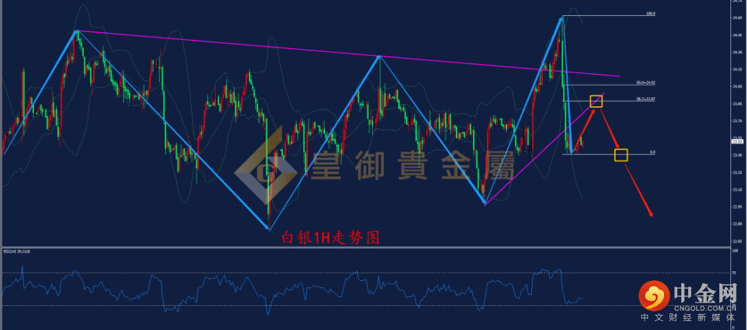 从下图白银1H周期图来看,昨日白银自高位回落,下破支撑线与趋势线,且布林带三轨拐头向下,表明行情由多转空的概率增大,上方关注23.85附近的斐波那契38.2%回调压力位,该位置同时也是趋势线的支撑压力转换位,可以作为今日较好的空单入场点,下方关注22.80附近的前低支撑。结合RSI指标来看,RSI在30.0附近徘徊,且仍处于50.0的多空转折线之下运行,后续盘整后再度向下测试30.0的概率增大。日内可以等待价格反弹23.85的斐波那契回调压力附近做空。今日非农数据,行情将产生较大波动,投资者需密切关注具体数据对行情的影响,把握盘中实时交易机会!