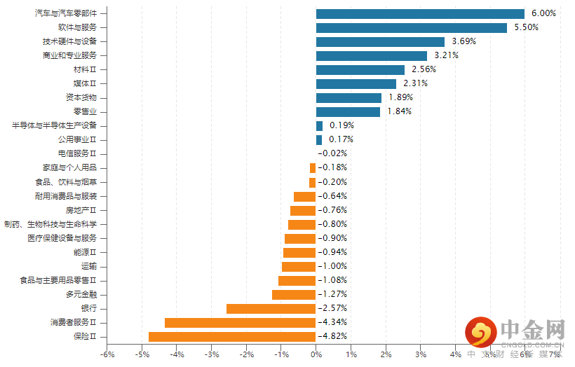从行业板块表现来看,本周热点主要集中在汽车与汽车零部件、软件与服务、技术硬件与设备等板块,而保险、银行等板块跌幅靠前。(见图2)