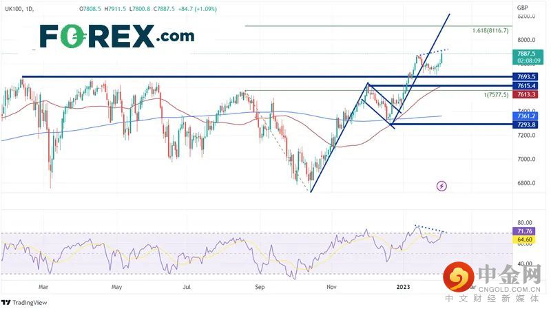 英国最重要的股指富时100指数(UK100)今天创下7911.5的历史新高。就在2022年10月13日,该指数还触及6705的低点。此后,富时100指数上涨了15%以上,并可能达到8000点。2022年12月初,指数触及2022年8月19日以来的近期高点所在的阻力位,随后停滞不前。它回落至7293.8附近的50日和200日移动平均线支撑位并形成旗形。守住支撑位后,富时100指数再次启动。旗形目标位是突破点加上旗杆的长度。在此情况中,目标位于8215附近。要达到该点位,它必须首先突破2022年8月19日高点到2022年10月13日低点区间的161.8%斐波那契延伸线所在的阻力位8116.7。但是请注意,RSI正与价格背离,处于超买区域。如果该指数果真回落,第一支撑位是一年前的支撑位和阻力位7693.5。在此之下,副支撑位落在7615.4,然后是50日移动平均线7577.5。
