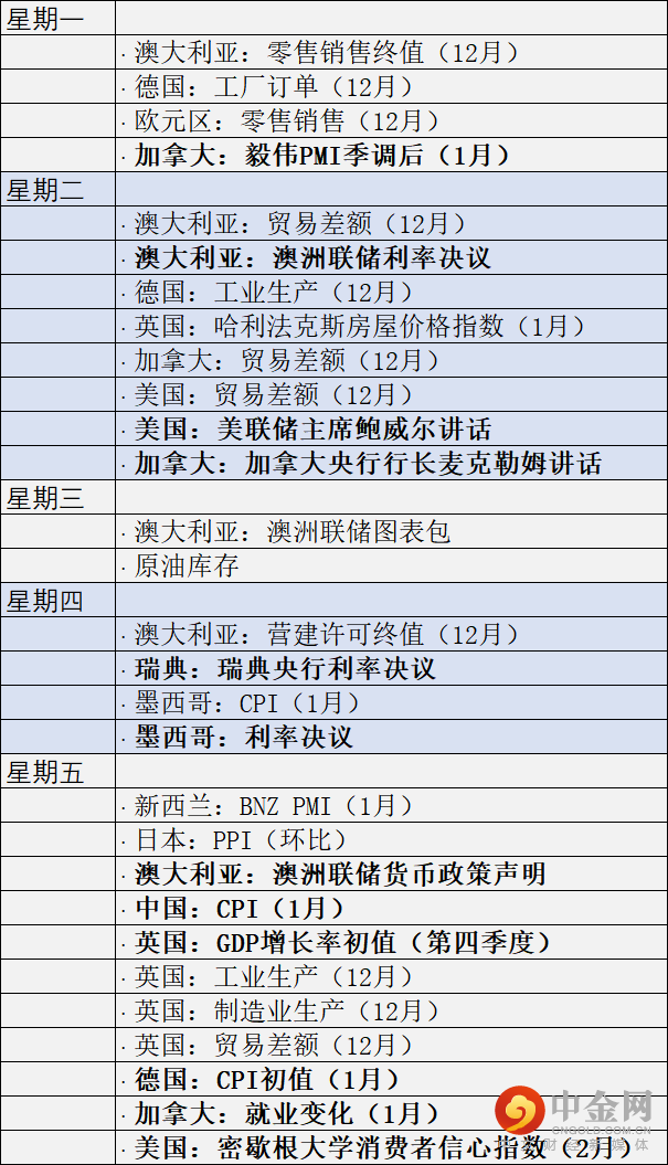 在经历了繁忙的1月底和2月初之后,本周经济数据的发布节奏将放缓。加拿大将于周一公布其毅伟PMI,中国将于周五发布1月CPI,英国也将在周五发布第四季度GDP。此外,瑞典央行和墨西哥央行也将在周四做出利率决议。本周发布的其他重要经济数据如下: