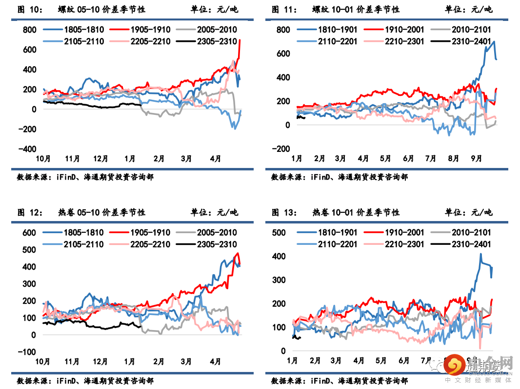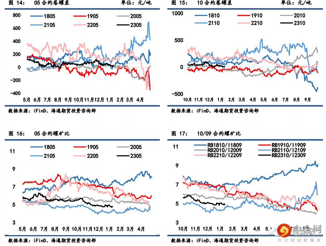 螺纹 05-10 月间价差从 49 微降至 37 元/吨;热卷 05-10 月间价差从 59 微降至 48 元/吨。热卷盘