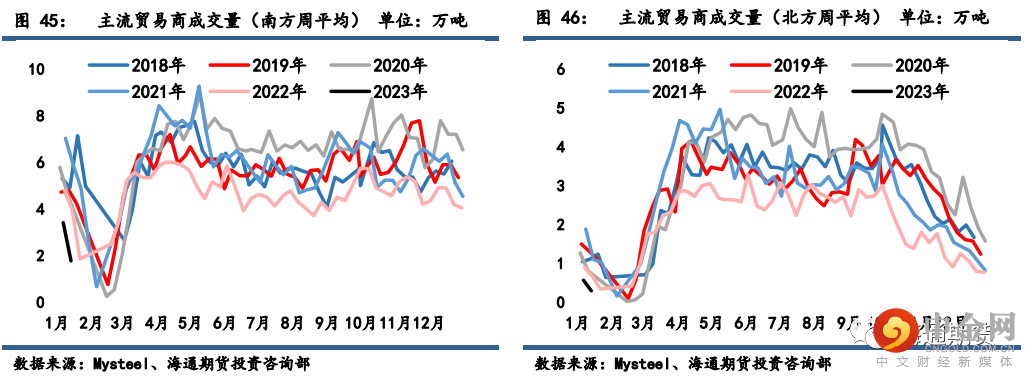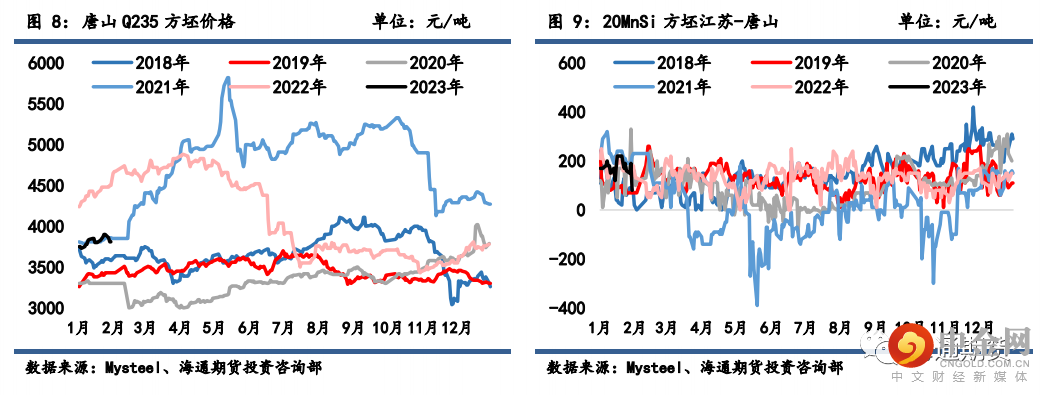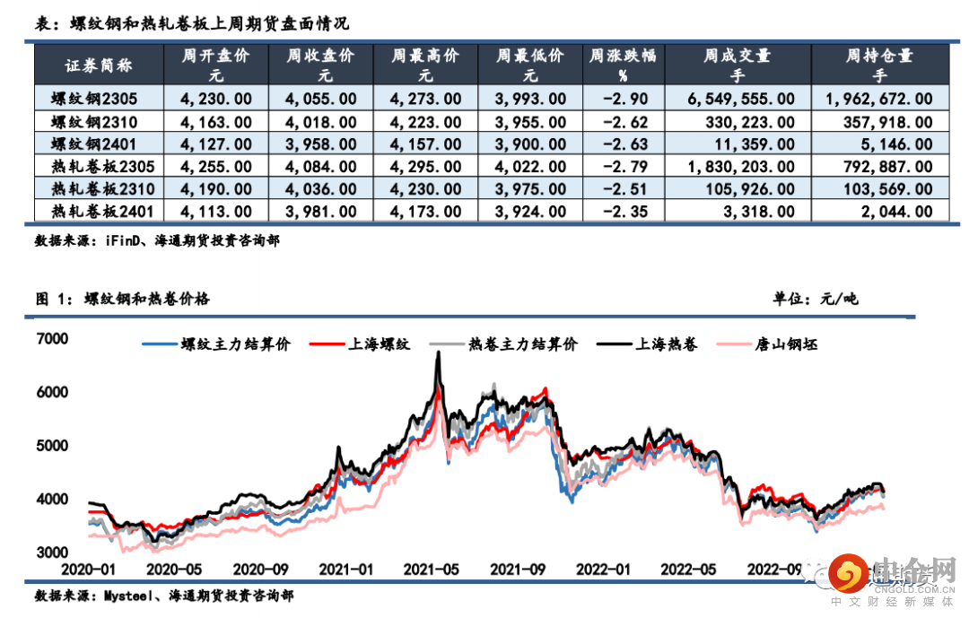 上周钢材期货盘面价格高位回落,现货价格大多偏弱运行。上周螺纹钢2305合约下跌2.9%至4055元/吨,热轧卷板 2305 合约下跌 2.79%至 4084 元/吨。上周上海螺纹下跌 50 元/吨至 4130 元/吨,杭州螺纹下跌 70 元/吨至 4140 元/吨,广州螺纹上涨 30 元/吨至 4570 元/吨附近,北京螺纹下跌 60 元/吨至 4060 元/吨。螺纹华东华南过磅价差降至-440 元/吨附近,华南北方过磅价差从 330 回升至 360元/吨附近。上海热卷下跌 150 元/吨至 4130 元/吨,广州热卷下跌 100 元/吨至 4150 元/吨,华东卷螺价差从热卷价格高出螺纹 100 元/吨缩小至 0 元/吨。上周各地区钢坯现货价格表现偏弱,唐山方坯 Q235 下跌 40 元/吨至 3810 元/吨,唐山 20MnSi下跌 40 元/吨至 3910 元/吨,江苏 20MnSi 下跌 150 元/吨至 3990 元/吨,江苏和唐山间价差降至 80元/吨。