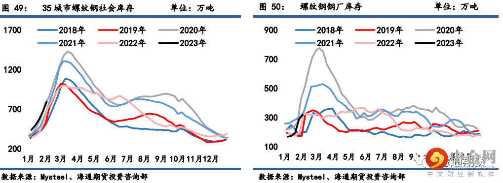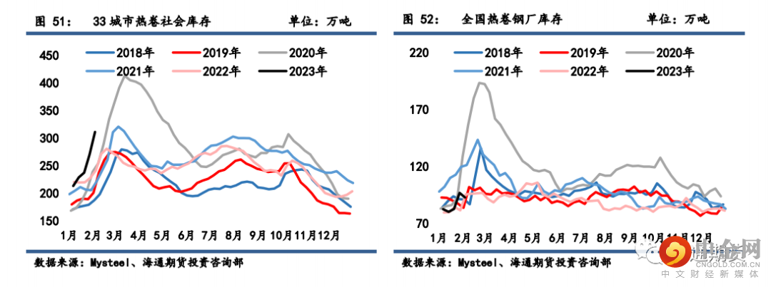 库存:螺纹钢和热卷库存延续社库和厂库同时积累的表现,增幅均有所扩大,且社库积累幅度仍高于厂库。螺纹钢供需底部基本将随着春节假期的结束而结束,当前焦钢企业利润格局整体依然偏差,供应增量整体仍将受限,而随着宏观及行业稳增长举措的传导,下游需求启动尚难证伪,春节后工地陆续复工时间基本在 2 月中旬附近,钢价下行空间有限,但短期在终端需求尚未启动的真空期内,资金行为带来的风险或仍有余留,需重点关注本周库存积累以及需求启动情况。
