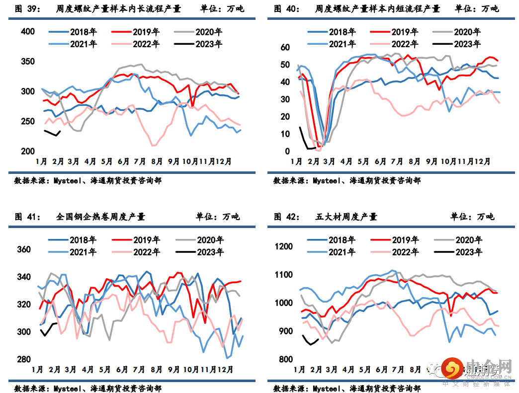上周钢材期货盘面价格高位回落,现货价格大多偏弱运行。上周螺纹钢 2305 合约下跌 2.9%至 4055 元/吨,热轧卷板 2305 合约下跌 2.79%至 4084 元/吨。螺纹钢和热卷近月合约表现略弱于远月,5 月和 10月价差微降;螺纹钢现货强于期货,螺纹主力基差走扩,热卷主力基差则小幅走弱;期货方面热卷表现略强于螺纹钢,卷螺价差微增;铁矿石表现强于成材,螺矿比价回落。供给:钢企高炉开工率和产能利用率环比四连升;五大材品种产量环比二连升,螺纹钢产量结束七连降,长短流程产量均反弹,热卷产量周环比大致维稳。