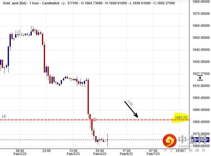 可以部署在$1,882美元左右建立淡仓盘,短线看淡金价一线至$1,845美元水平后止赚,止损在$1,890美元。