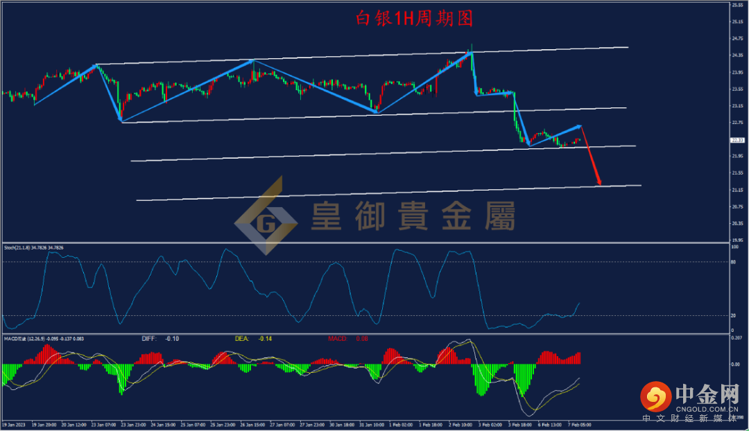 从1H周期走势结构看,白银跌破震荡区间关键支撑,走出3波下行结构,当前走势可看做第四波调整结构,后市大概率延续下跌,操作上可关注空单机会。结合指标来看,Stoch指标自20之下上行,目前还未到达超买区,还有上行空间,MACD指标处于零轴之下金叉,短线多头偏强。综合以上分析,白银1H周期处于空头趋势之中,但短线有反弹需求,日内操作可在反弹后尝试空单,上方压力关注上周五下跌放缓位置22.60附近。