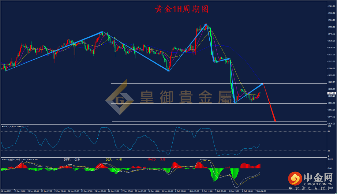从1H周期走势结构看,黄金自1960附近下跌,走出3波下行结构,当前走势可看做第四波调整结构,后市大概率延续下跌,操作上可关注空单机会。结合指标来看,Stoch指标自20之下上行,目前还未到达超买区,还有上行空间,MACD指标处于零轴之下金叉,短线多头偏强。综合以上分析,黄金1H周期处于空头趋势之中,但短线有反弹需求,日内操作可在反弹后尝试空单,上方压力关注周五下跌放缓位置1886.0附近。