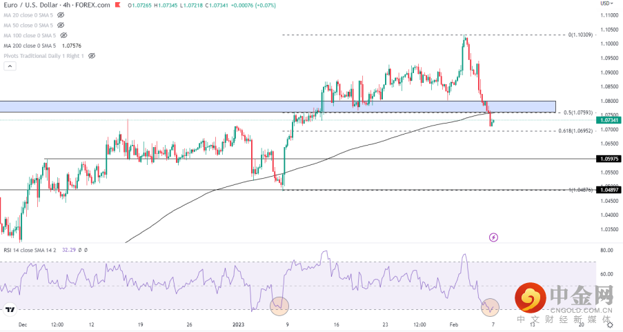 超卖的RSI指标暗示汇价或许能在1.0695-1.0759附近止跌,但若无法快速回到1.08上方维持过去几个月的上升趋势,后市前景仍旧偏空。下方更深的回撤目标包括了1.0597一线以及1月低点1.0482。