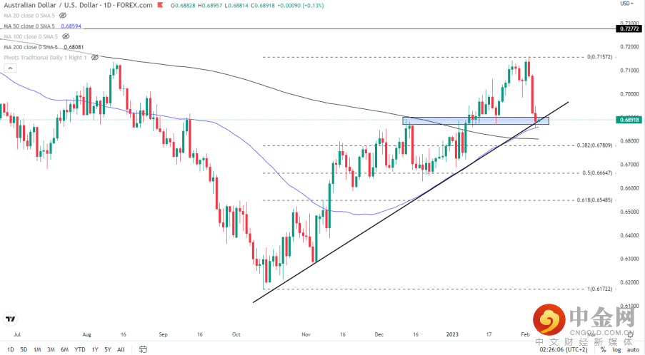 鹰派立场或许能帮助澳元守住50天均线并重回0.69上方。但若释放出结束加息的信号则将引发进一步的抛售,关注下方200天均线附近的0.6808以及10-2月涨势的38.2%的回撤位0.6780。