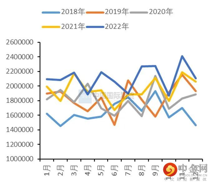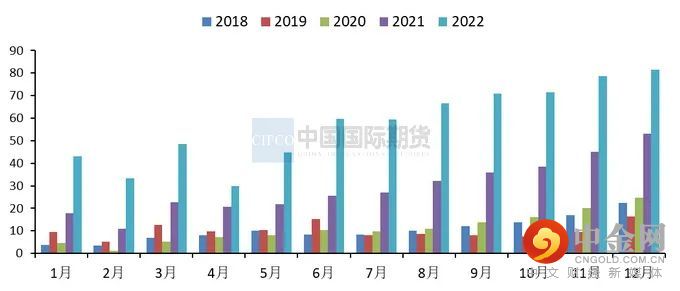 2022年电解铜累计产量为1028万吨,同比增加3.07%。其中12月电解铜产量为87万吨,环比回落3.3%,同比持平,且较预期的 88.79 万吨低 1.79 万吨。从12月具体的生产情况来看,新投产的两家冶炼厂增量未达到预期,且有4家冶炼厂处于检修状态,均集中在粗炼端,受粗铜供应紧张的制约,电解铜产量受到一定影响。此外,部分冶炼厂前期生产进度较快,在提前完成22年的计划产量后,12月刻意放慢进度。因此在多重因素影响下,使得12月电解铜产量不及预期。而对比2022年各月铜冶炼厂的开工率,发现除了2022年9-11月国内铜冶炼开工率相对偏高以外,其他月份基本处在往年中等偏低的水平。这主要受到了部分因素的扰动,如冶炼厂集中检修、年内突发停产、高温限电、冷料紧张等,使精铜产量增长有不及预期的情况出现。步入2023年,虽然受春节因素影响,多数冶炼厂开工率较2022年12月稍有回落,但随着冶炼企业检修恢复及新增投产不断释放,预计1月电解铜产量为89.5万吨,环比上升2.87%,同比上升9.7%。根据SMM统计的数据,2023年铜粗炼和冶炼产能将分别增加46万吨和56万吨。预计产能投放时间仍主要集中在下半年,拖累冶炼企业开工的资金因素及限电因素也将有所缓和。