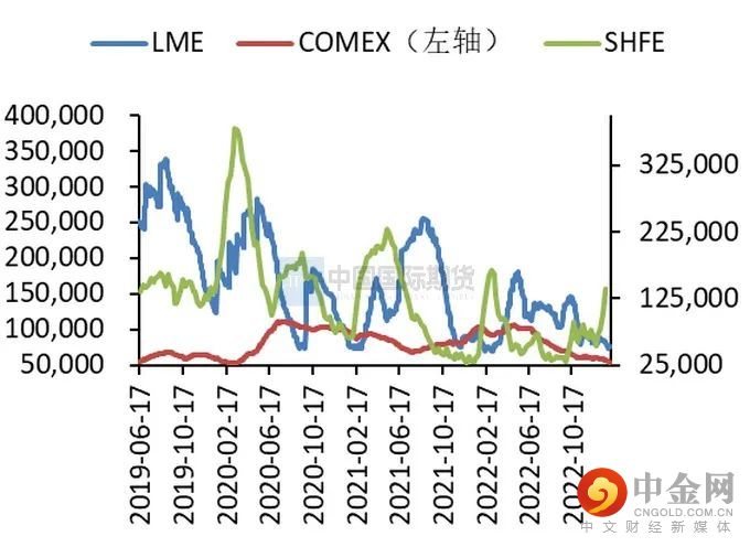 图2-8:全球三大交易所铜库存 单位:吨、短吨