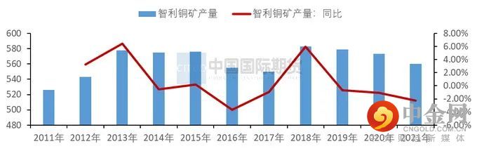 图2-1:智利铜精矿产量 单位:万吨、%