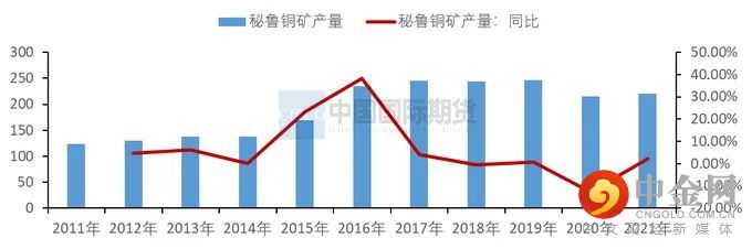 图2-2:秘鲁铜精矿产量 单位:万吨、%