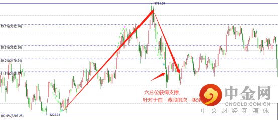 确认突破级别后,通过黄金分割方法测量调整目标幅度,一般同级别调整大概率为前一波段的38.2%或61.8%。调整幅度小于61.8%时,该波段为针对以前一个波段的次一级别趋势,调整不会影响前一级别行情方向,未来仍有机会沿着原有趋势运行。幅度超过61.8%时,调整级别升级,与前一波段相等,大趋势发生改变,调整可能突破前一波段空间。我们绘制黄金分割的重点就是找到当前调整对应的级别,通过前一级别的空间,寻找次一级别的支撑。注意,由于黄金分割的支撑有效性低于筹码,所以只用于估算调整目标,只要行情围绕不同分位点附近运行我们即认为支撑有效。