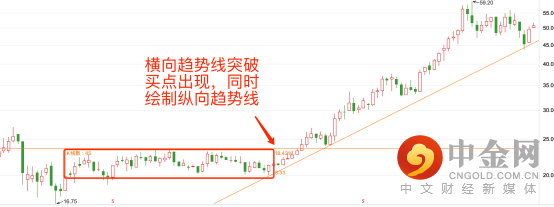 横向趋势线的突破也可作为买卖点,因为一旦突破市场就会进入有趋势阶段,即可绘制对应趋势线。