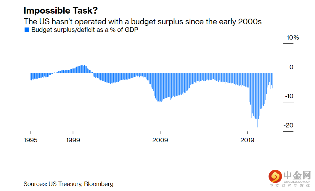 在说明为什么预算赤字占比更令人担忧之前,有必要全面了解当前的债务水平。目前美国债务占GDP的102%,跟疫情前则略低于80%的占比相比大幅提升,这是因为政府为缓冲疫情对经济的影响而大举借贷。