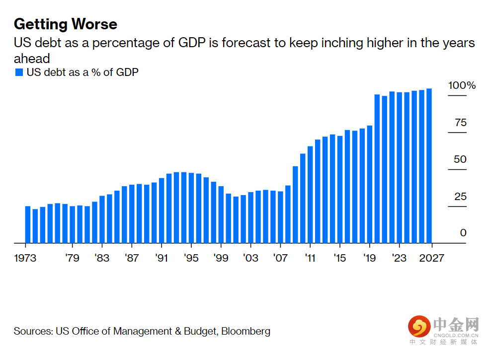 不过,31万亿美元的债务并非最令人担忧的问题,双方真正应该关注的数字是4.3%——这是国会预算办公室预测的从现在到2027年的平均预算赤字占美国GDP的比重。
