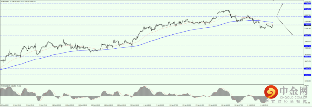 如果 HK50 运行于 22127 一线下方,届时关注 21450 和 20467 两个位置的支撑力度。