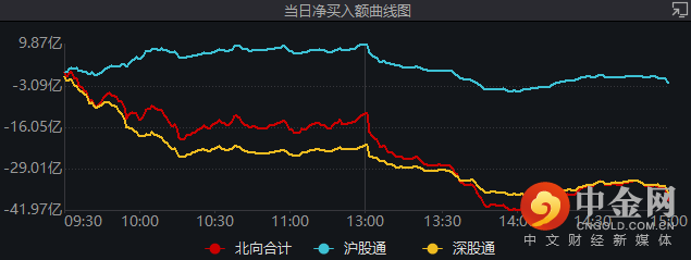 净买入额曲线图来看,北向资金全天呈现流出局面,午后更是有加速流出的迹象。其中,沪股通净买入-2.12亿,深股通净买入-36.49亿。