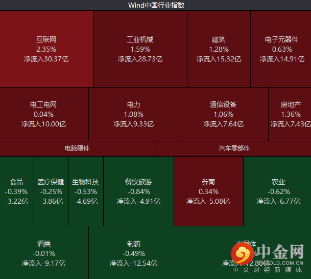行业板块方面,互联网、工业机械、建筑等呈现净流入态势,半导体、制药、酒类等内容则资金净流出。