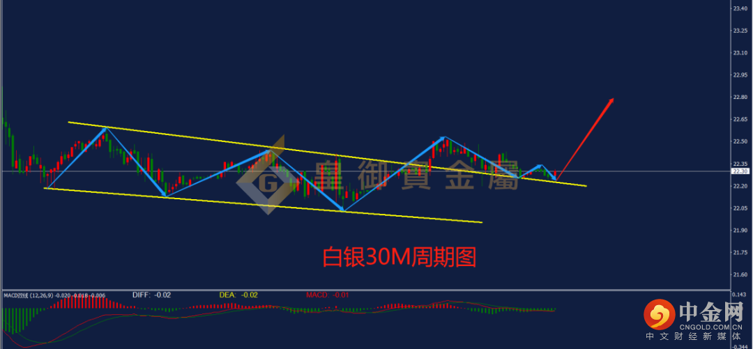 从下图白银30M周期图来看,白银于本周走出高低点持续下移的下降楔形结构,行情于结构内震荡下行。昨日,白银向下跌至22.04附近后出现底背离信号,行情迎来向上的调整,成功上破结构顶部压力并进行了回踩,当前白银企稳于楔型结构上方。从指标上来看,MACD指标的空头动能处于放量阶段,但行情未迎来有效回落,预计白银大概率将于后市迎来上涨。日内操作建议以逢低做多为主,可于下方支撑线22.20一线进行入场。