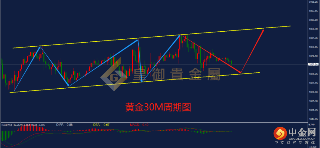 从下图的黄金30M周期图来看,黄金此前跌至1860一线后进入调整,当前整体走出高低点逐渐上移的上涨形态,并构建上行通道,行情于通道内震荡上行。昨日欧盘时段,黄金再次测试结构顶部压力1886一线后迎来回撤,目前再次调整至结构底部支撑附近。从指标上来看,MACD指标的多空动能无明显放量形态,且DIFF与DEA双线回归至0轴附近,预计行情大概率将延续于结构内部进行走势,短期内无突破迹象。日内操作建议可于上行结构内高抛低吸,当前可尝试于结构下方支撑1868一线入场多单。