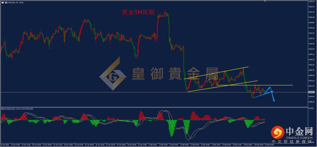 从下图的黄金1H周期图来看,黄金顶部形态确立后延续下跌趋势不变,局部构建了旗形整理形态,周四行情压力位1890空头发力强势跌破了形态底边支撑形成破位走势,周五行情超跌后反抽压力位1870不过继续延续弱势震荡下行走势。从MACD指标上来看,快慢线跌破0轴空头主导行情,目前反抽0轴压力位,若快慢线0轴下形成死叉信号,空头有望开启新的下跌浪。日内操作建议以逢高做空为主。