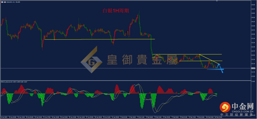 从下图白银1H周期图来看,白银高位头肩顶部形态确立后,价格延续下跌趋势行情不变,局部反弹构建了宽幅箱体形态,反弹高点分别为22.50,22.25,反弹高点不断降低表示价格延续下行趋势。结合MACD指标看,快慢线0轴下方死叉出现,表明空头继续发力延续下跌浪概率较大。日内操作建议以逢高做空为主,可于上方关键压力22.00一线进行入场。