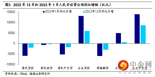 社融信贷实现“开门红”,反映经过疫情后,经济从12月下旬以来开始内生恢复。我们认为,高增信贷的背后,一方面,由于年初银行冲信贷的动力比较强,项目集中投放;另一方面,疫情政策的优化也释放了部分融资需求。不过,与去年四季度类似,1月的信贷可能更多体现的依然是积极政策的效果,包括此前基建层面的、制造业层面的等等。然而,经济内生融资需求的回升力度,仍有待观察。