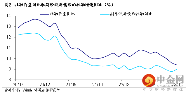 央行公布2023年1月新增社融5.98万亿元,超出Wind一致预期,带动社融存量增速回落至9.4%。