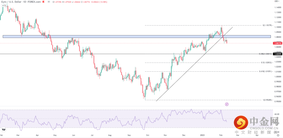 欧元跌破图中趋势线后连续第二周收低,重新回到1.08一带的阻力区域下方,该区或将成为近期欧元的分水岭。若无法快速攻克意味着有进一步回落至1.0460的风险,这里是9-2月涨势的38.2%回撤位。