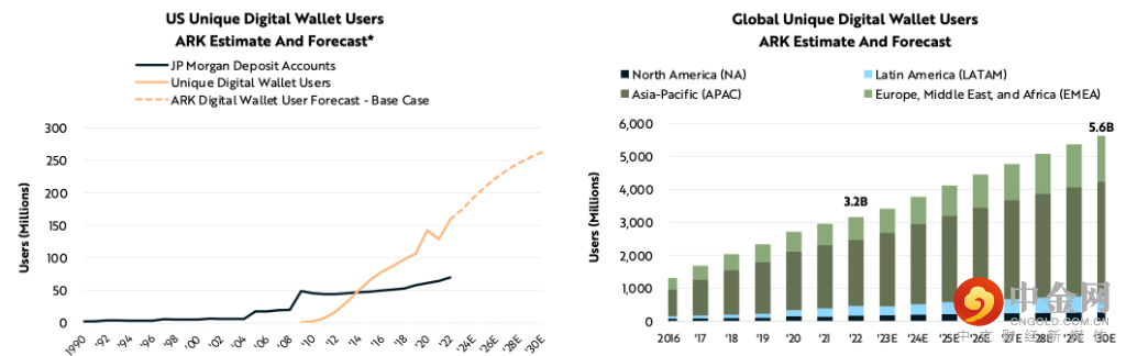 ARK认为未来的8年时间,数字钱包的价值有望从目前1万亿美元,再增加约4500亿美元。