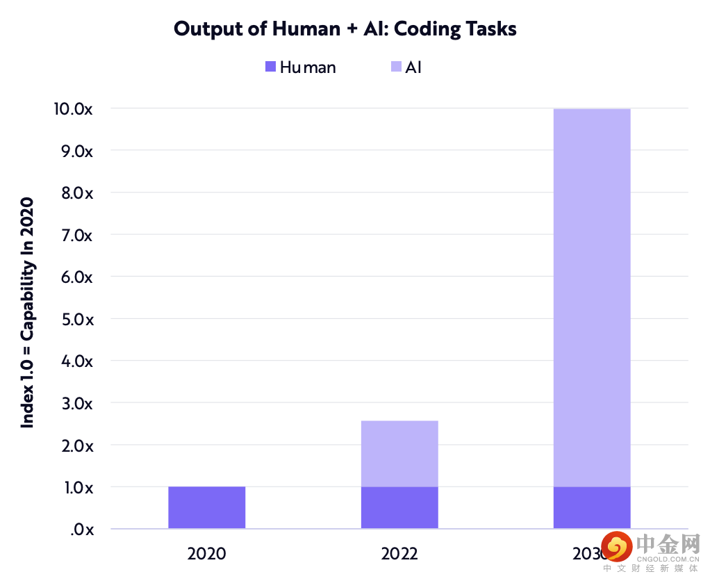 以编程为例,在AI的帮助下,程序员编写一套代码的时间将减少55%。同时,由于培训成本的不断下降,到2030年,像Copilot这样的人工智能编码助手可以将软件工程师的产出提高10倍。