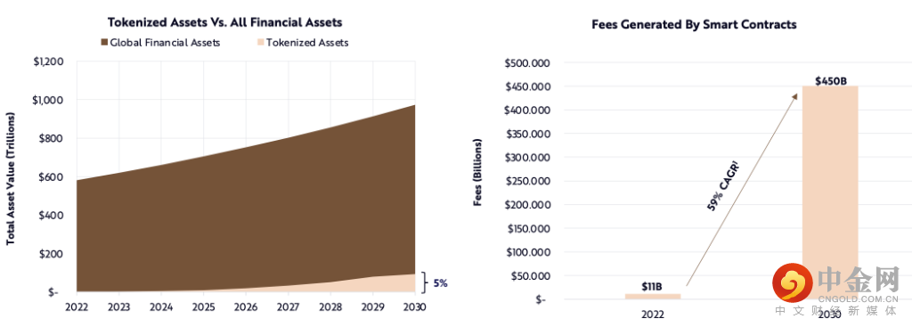 智能合约可以促进代币化资产的发起、拥有和管理,而成本仅是传统金融服务的一小部分。如果金融资产以类似于早期互联网采用的速度迁移到区块链基础设施,并且去中心化的金融服务收取传统金融服务的三分之一的费用,那么,到2030年,智能合约这项业务可以催生4500亿美元的年费,创造出5.3万亿美元的市场价值。