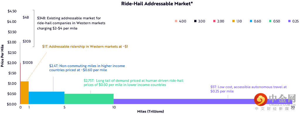 ARK指出,经过调整通货膨胀率后,自T型车从第一条装配线下线以来,拥有和操作私人汽车的成本没有改变。ARK估计,在规模上,2030年,消费者乘坐自动驾驶出租车,每英里花费0.25美元,将被广泛使用,乘车服务可能会创造出11万亿美元的市场: