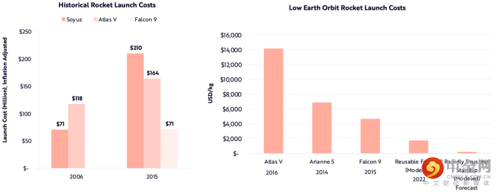 ARK的研究表明,到2027年底,天线成本可能从现在的大约500美元降至300美元,同时,垂直整合的火箭和卫星发射应该能使火箭发射的成本继续下降: