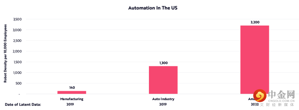 ARK认为,亚马逊可能接近于机器人技术的拐点,正处于大规模采用机器人的早期阶段,为其他行业指明了方向。为了达到亚马逊的机器人密度,美国制造业必须增加400万台机器人