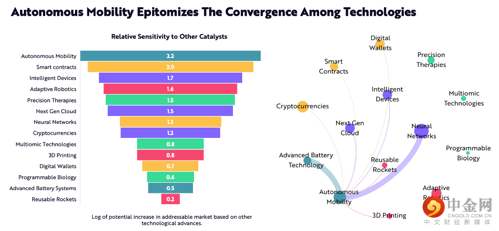 ARK在报告中指出,该创新平台涉及多项可投资的技术,这些技术的成本正在急剧下降,对多个行业产生影响,并将激发多个领域的创新动能,包括:
