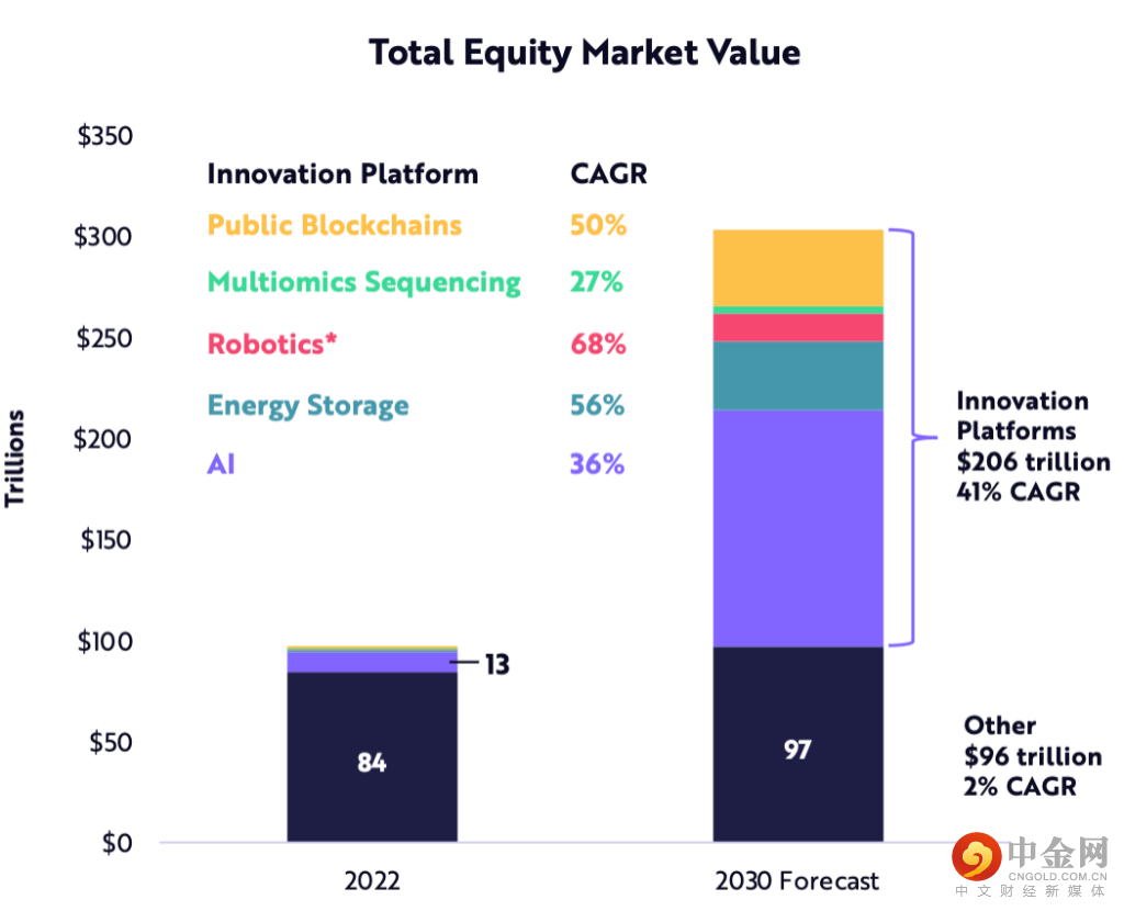1.融合了人工智能、区块链、多组学整合、能源存储及机器人技术的创新平台,所创造的市场价值将会以每年40%的速度增长,预计从2023年年初的13万亿美元增长至2030年的200万亿美元。