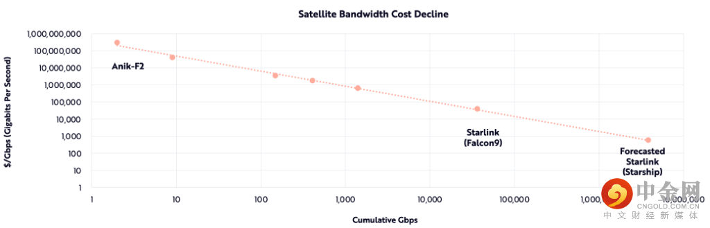 根据莱特定律,卫星带宽成本在轨道上每累计翻一番,就应该下降大约45%的千兆比特。自2004年以来,卫星带宽的成本已经下降了7500倍,从300000000美元降至40000美元/千兆比特每秒(Gbps)。在未来五年内,成本可能再下降40倍,达到约 1000美元/Gbps。